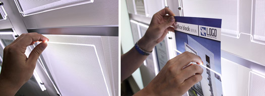 Der Austausch von Fotos, Grafiken oder Informationen ist denkbar einfach und schnell, die modulare Gestaltung ermöglicht jederzeit einer Erweiterung des Systems. fly shine ist auch für Vitrinen und Schaufenster sehr gut geeignet!