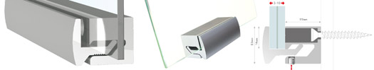 Die Clamper werden mit nur zwei Bohrungen an der Wand nach Wunsch oben, unten oder seitlich fixiert. Dann können mit einem Handgriff zwei Glasscheiben im Sandwichsystem oder eine Glasscheibe (in verschiedene Stärken) eingesetzt werden ...