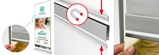 myMAGO stand up displays bestehen aus einer einfach und schnell aufbaubaren Aluminiumkonstruktion mit Kunststoffverbindern. Das besondere Highlight ist die Bannerbefestigung mit Magnettechnik. Damit wird jeder Bannerwechsel zum "Kinderspiel".