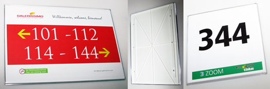 Kunststoffschilder punkten mit Leichtigkeit, Transparenz (dank transparenter Rückseite ideal für Glaswände oder Glastüren) und Qualität. Querformatige Montage bevorzugt.