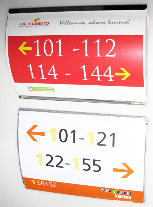 Schilder überzeugen durch sehr flache Bauweise, sie liegen eng am Hintergrund an, haben eine weisse Rückseite. Günstiger Preis!